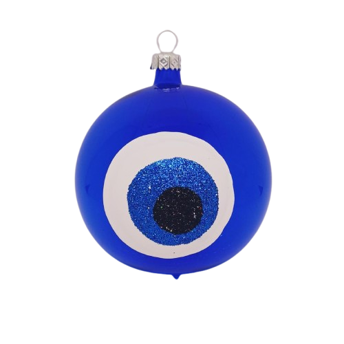Xειροποίητες Χριστουγεννιάτικες μπάλες από φυσητό γυαλί σε σχέδιο μάτι, διαθέσιμες σε δύο διαστάσεις.