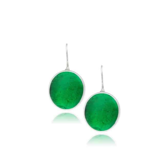 Από την συλλογή της σχεδιάστριας Ευτυχίας Σιαμούλη, χειροποίητα σκουλαρίκια με αμαζονίτη, πέρλα και αιματίτη.